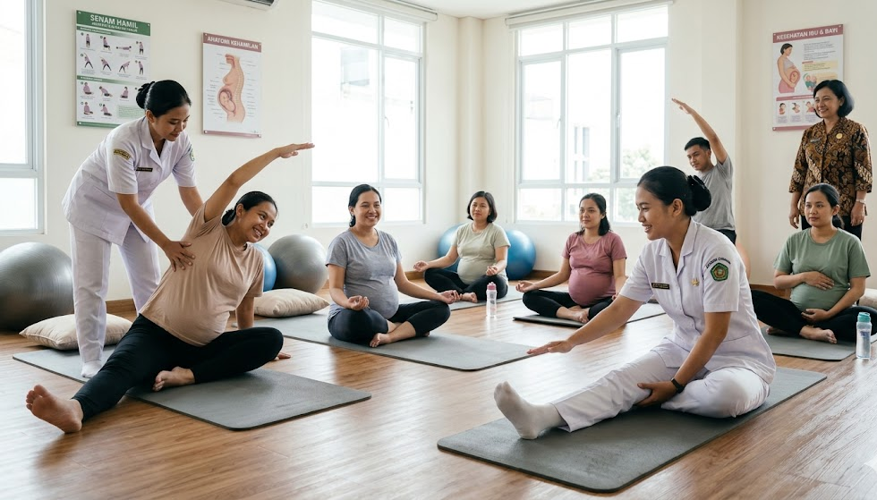 Ibu hamil dipandu untuk melakukan gerakan seperti peregangan ringan, latihan pernapasan, dan penguatan otot panggul.